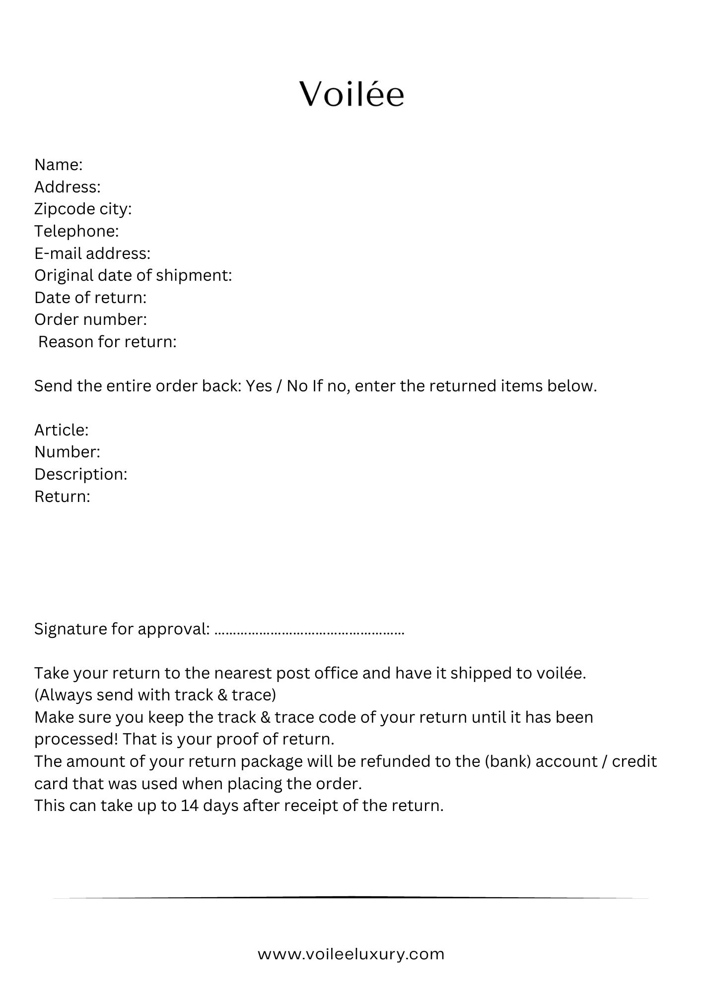 Do you want to return? Let us know within 14 calendar days. Send an e-mail to info@voileeluxury.com